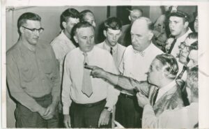 CHICAGO, August 1st POINTING ACCUSING FINGER Larry Epstein, right, points a finger at Lawrence Neumann, left, at detective bureau today. Neumann, 28, was captured in an alley on the near west side, and police said, he admitted the three shotgun killings; for which he has been hunter for nearly two months. Lt. James McMahen said Neumann gave an oral statement that he killed two men and a woman on June 8, one of the victims being Epstein’s bother.