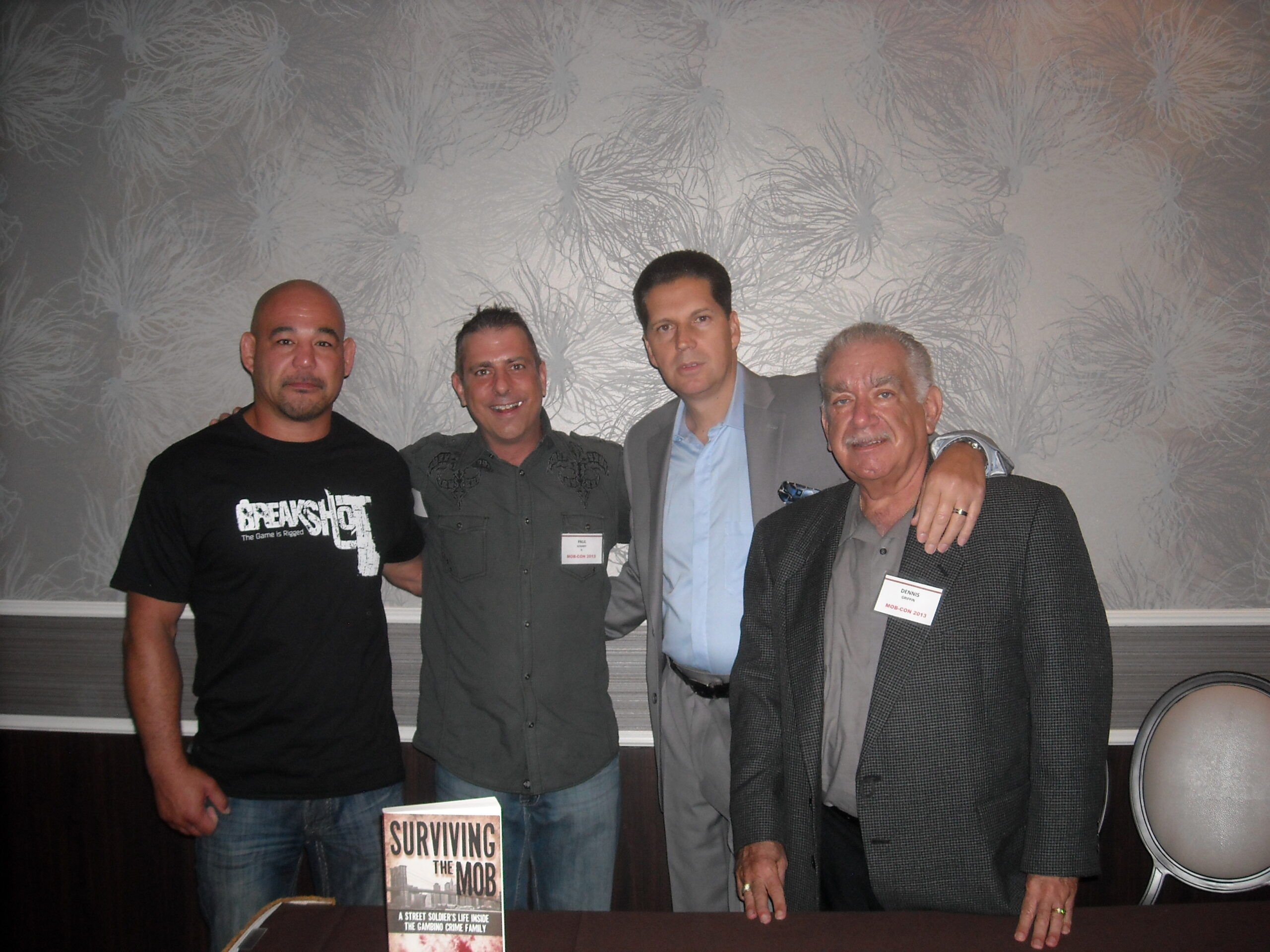 Kenji Gallo, Paul Scharff, Andrew DiDonato, and Dennis Griffin at Mob Con 2013 in Las Vegas. Posing behind Andrew DiDonato’s book SURVIVING THE MOB co-authored with Dennis Griffin.