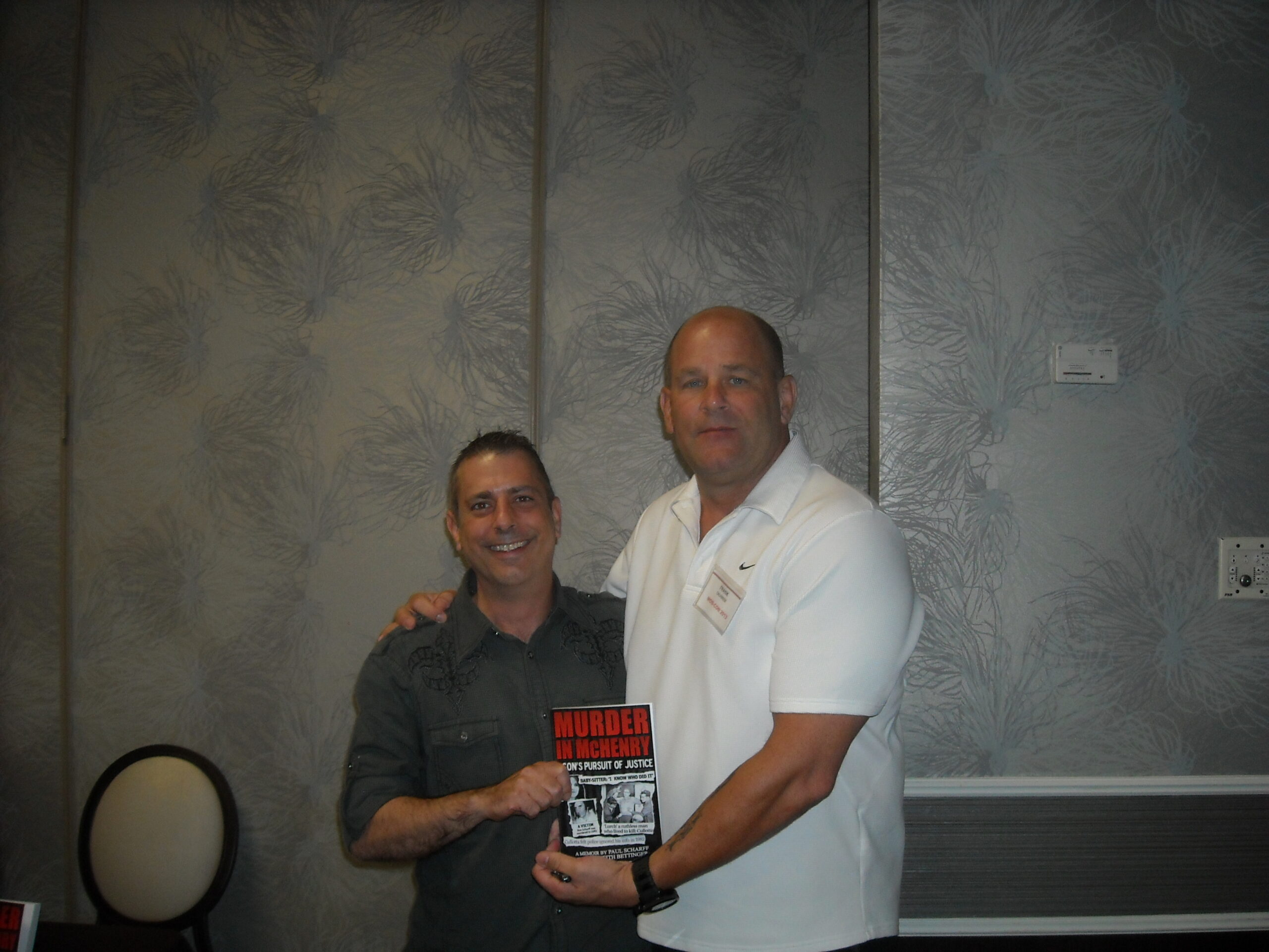 Paul Scharff and Frank Calabrese Jr. holding the book Paul Scharff’s book MURDER IN MCHENRY at Mob Con 2013 September 7th in Las Vegas.