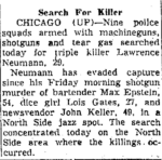 - Connellsville Daily Courier June 14th, 1956. Police armed with machine guns are trying to track down Larry Neumann for the triple murders of Max Epstein, Lois Gates, and Johon Keller. Photo’s from the triple murder can be found here http://www.mchenrycounty1981.com/images/cullottas-hole-in-the-wall-gang-and-larry-neumann/